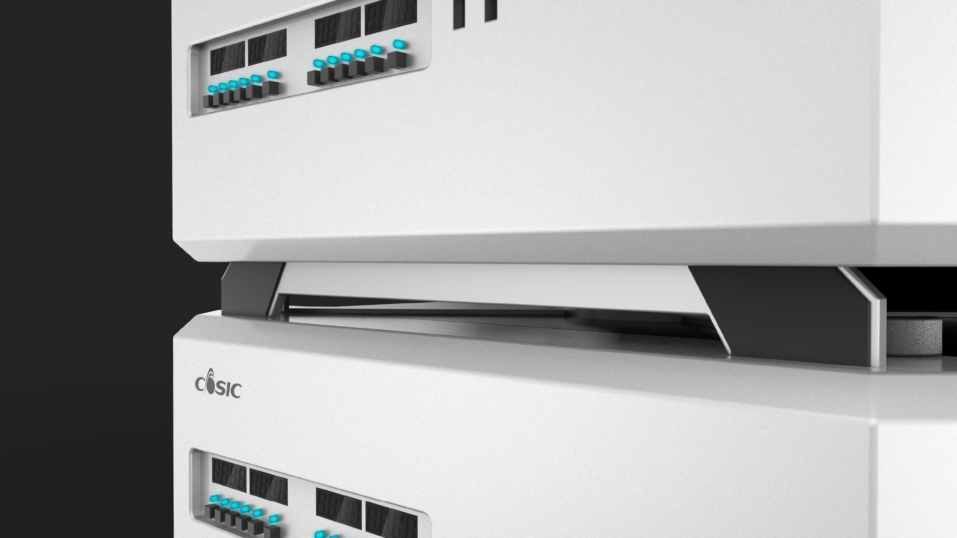 产品可以叠加使用,产品底部的前垫脚可以旋转90°,可以跟下层产品顶部的凹槽相吻合,使产品稳固的叠加在一起。