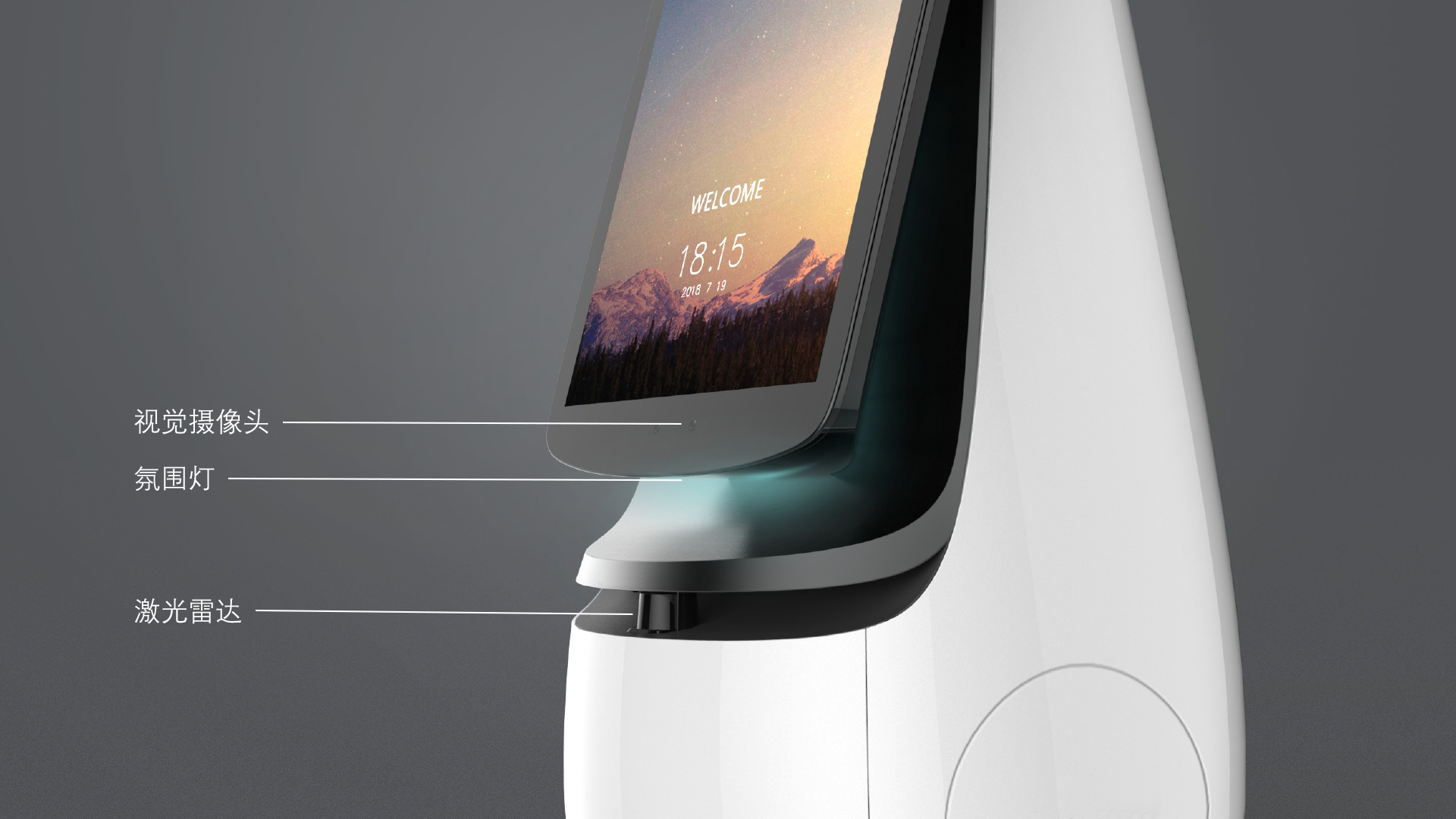 在写字楼及娱乐场所中的全方位机器人、可进行迎宾、展示、讲解、带路及人机交互服务。